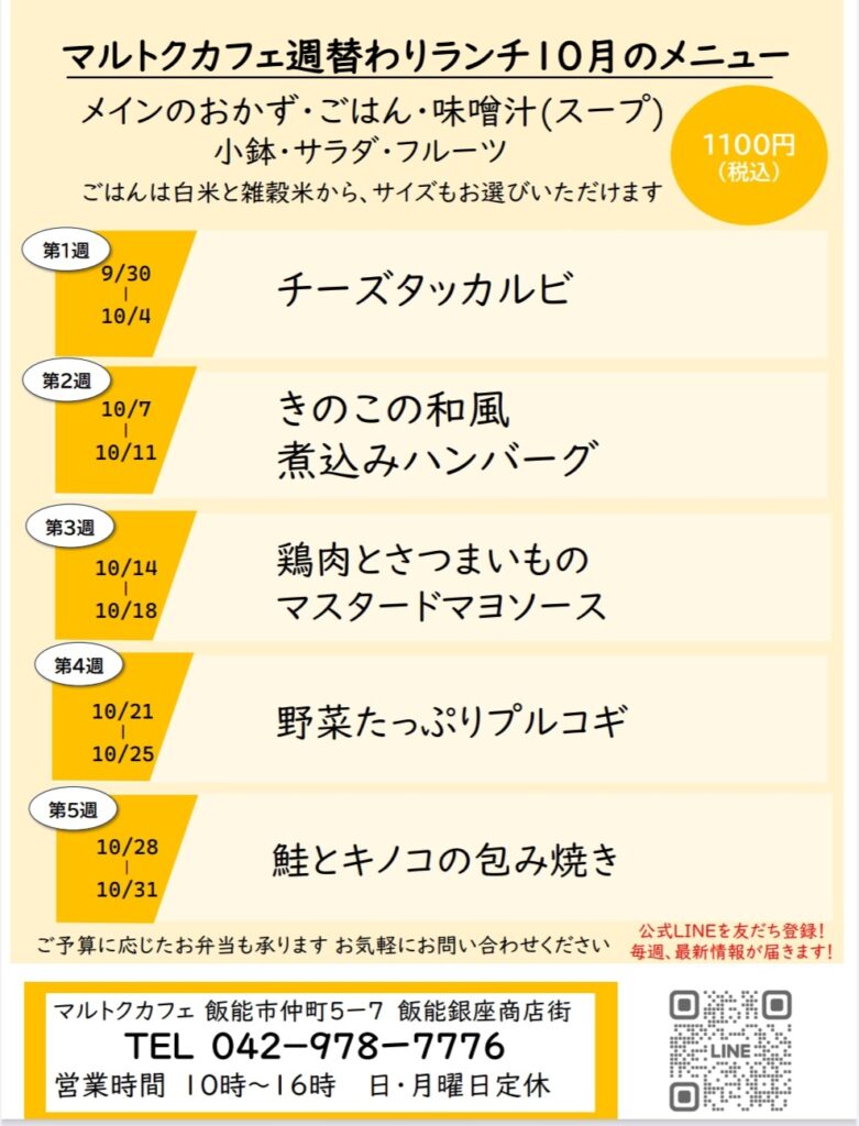 10月の週替わりランチをご案内します。栄養バランスと満足感、季節感を大切に、すべて手づくりでご用意しております。 お昼休みに、お友達と、おひとりでもほっとひと息つきにいらしてください。秋の行楽シーズン、天覧山へのハイキングや飯能の自然を楽しんだ後にぜひお立ち寄りください。お待ちしております。